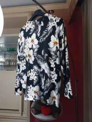 Jersey de punto con estampado de hojas en azul marino sobre fondo blanco. Presenta un bajo asimétrico con un tejido vaporoso., tallaje mas pequeño es decir talla como L-XL. En perfecto estado - Manga tres cuartos. - Cuello redondo.