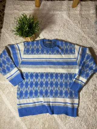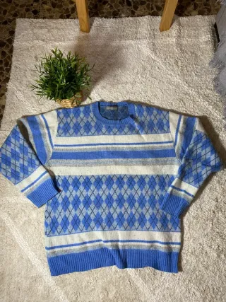 Jersey de punto vintage con un diseño de rombos y rayas. Fabricado en EE. UU. - Tejido de lana. - Diseño de rombos en azul y gris. - Rayas horizontales en blanco y gris.