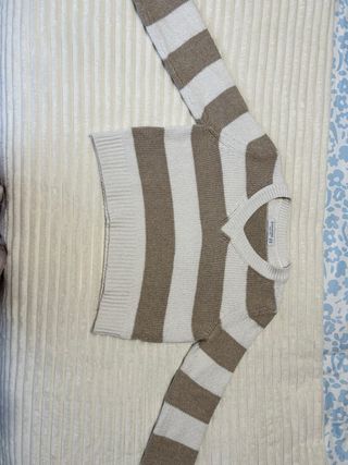 Jersey de rayas de Zara. 100% algodón. Color gris y blanco, talla L. Está como nuevo, en perfectas condiciones. Las medidas del jersey se pueden ver en las fotos del producto. Precio negociable. Se realizan envíos. Cualquier duda respondo de inmediato.