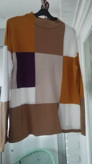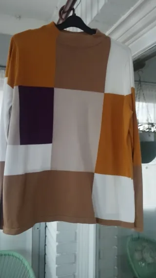Jersey de manga larga con un diseño de cuadros muy original y llamativo. Talla 46 holgada... - Cuello redondo.un poco alargado y un poco alto - Diseño patchwork.colores blanco... morado...mostaza....beige... precioso el cuadrado oscuro es morado 🟣