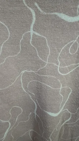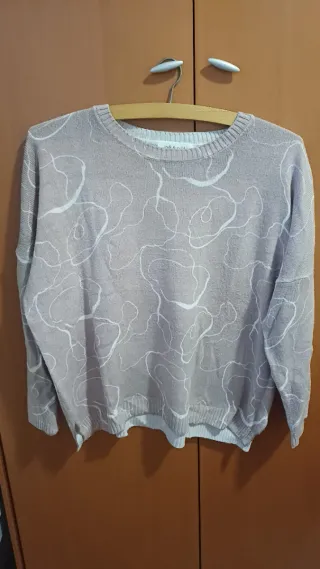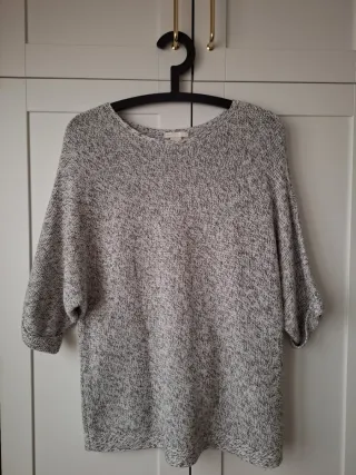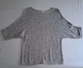 Jersey de punto fino con un diseño jaspeado en tonos grises y blancos. Las mangas son de corte tres cuartos y el cuello es abierto. Largo 70cm De sisa a sisa 50cm