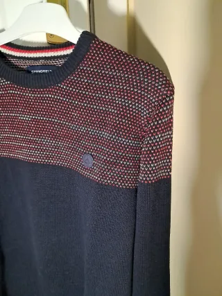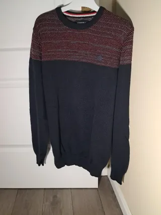Jersey de manga larga para hombre, con un diseño moderno y bicolor. - Parte superior con tejido texturizado en color burdeos y detalles blancos. - Parte inferior lisa en color azul marino. - Cuello redondo. - Pequeño logo discreto en el pecho. Totalmente nuevo.