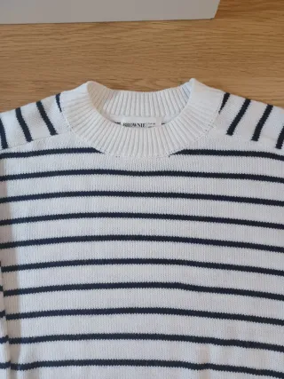 Jersey de punto con diseño de rayas marineras. Cómodo y versátil. Marca Brownie. Talla XS,tallaje grande como una S/M. Impecable. - Diseño de rayas horizontales. - Cuello redondo. - Manga larga.