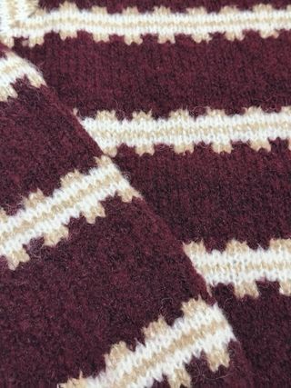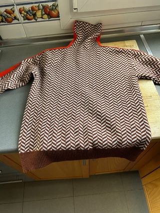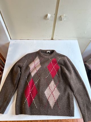 Jersey de punto con un clásico diseño de rombos. - Base marrón con rombos en rojo y beige. - Hilos de contraste en blanco y rojo. - Cuello redondo. Vendo por cambio de estilo.