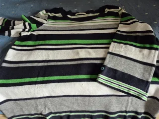 Jersey de punto con diseño de rayas horizontales. - Diseño de rayas en blanco, verde y azul marino. - Pequeño logo de la marca bordado en el pecho. - Esta en buen estado, comprado en El Corte Inglés. - Composición: 82 % algodón. 18 % acrílico. - Adjunto foto de los codos para ver que están en perfecto estado.