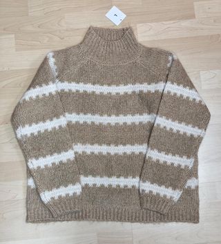 Jersey de punto con cuello alto y diseño de rayas horizontales. - Diseño de rayas en beige y blanco. - Tejido suave y cálido.