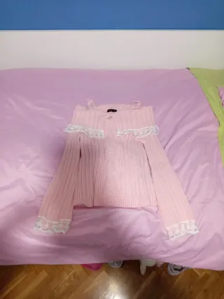 Jersey de punto fino en tono rosa, con un diseño aesthetic. Nunca lo he usado está perfecto. - Detalle de puntillas de encaje blanco en escote y puños. - Diseño de canalé.