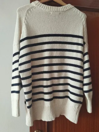 Jersey de rayas blancas y azul marino, sin estrenar. - Diseño de rayas horizontales. - Cuello redondo. - Manga larga.