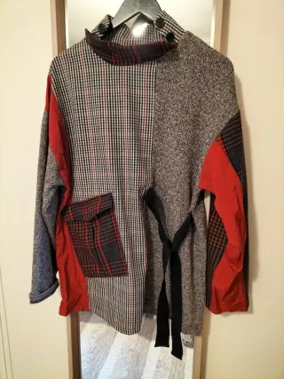 Jersey largo con un diseño patchwork muy original. Una manga se me pegó con la plancha pero hace ya tiempo y no ha ido más,el la foto se nota más - Combinación de tejidos y estampados. - Detalle de bolsillo en la parte delantera. - Cinturón negro para ajustar. - Cuello alto con botones.