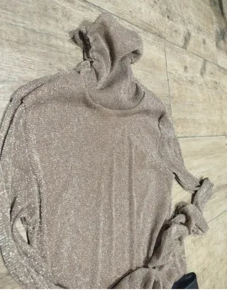 Jersey color entre beige y camel, con pedrería de perla, mangas abullonadas, cuello alto y manga larga. El cardigan es talla única pero yo utilizo una talla M y queda perfecto. Solo tiene una puesta, esta nuevo. Comprado en un comercio local.