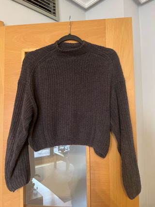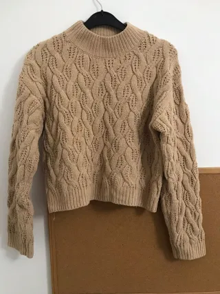 Jersey de punto con un diseño trenzado y cuello alto. Es una prenda cómoda y con estilo. - Tejido suave al tacto. - Diseño de trenzas. - Cuello alto. Talla XS/S....calienta bien 🤭.