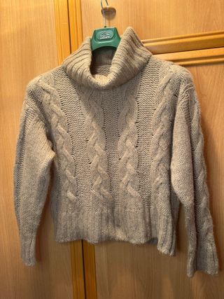 Jersey de punto grueso con cuello alto. Presenta un diseño de trenzas y calados. Poco uso. - Cuello alto acanalado. - Tejido de punto con textura.