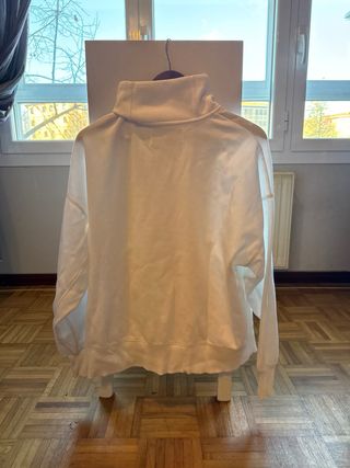 Jersey mostaza. Cuello alto. Aperturas laterales. Etiquetas interiores que indican composición. Cordones internos para colgarlo mejor. Es amplio a pesar de ser xs.