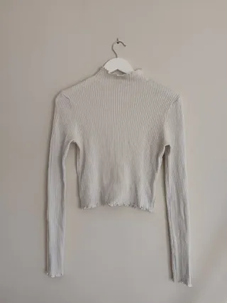 Jersey de punto fino en color blanco. Tiene un diseño acanalado y cuello alto con un ligero volante. Tela elástica. - Manga larga. - Bajo y puños con acabado festoneado.