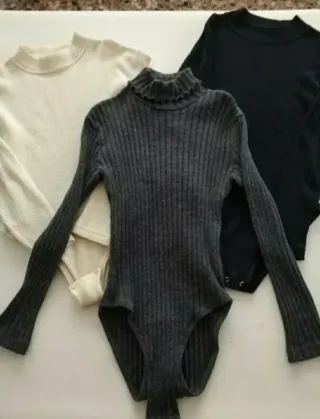 Conjunto de tres bodys de manga larga uno con cuello alto y tejido de canalé. - Los 3 por 8€. - Diseño acanalado. - Cuello con volante. - Cierre de corchetes en la parte inferior.