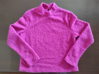 Jersey de punto con cuello alto y diseño jaspeado en tonos morados y rosas. Mide 60 cm de largo y 40 cm. de axila a axila