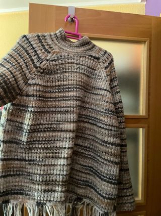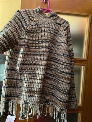 Jersey de punto grueso con cuello alto y diseño de rayas. Ideal para un look cómodo y abrigado. largo 80 con flecos de sisa a sisa 69 - Tejido de punto suave. - Diseño de rayas en tonos marrones y grises. - Acabado con flecos en el bajo.