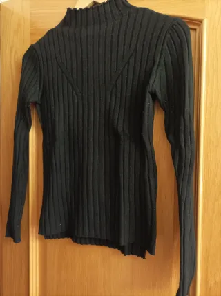 Jersey de cuello alto en color negro, con un diseño de canalé que le da un toque moderno. Es una prenda cómoda y versátil. La talla dije M pero es un bien S. - Tejido acanalado. - Cuello alto.
