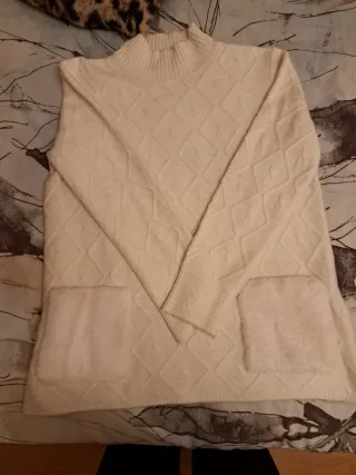 TALLA S -M Precioso jersey de cuello alto y manga larga finito pero muy abrigadito. -Tejido suave al tacto como angora muy amoroso. -Broche frontal de lazo en la parte delantera. Se entrega limpio y listo para usar. DALE VIDA 🌎... REBAJADO POR FALTA DE ESPACIO... Más jerseys de angora,ropita de niños, abrigos, bolsos, zapatos nuevos, deportivas Converse originales,libros, botes cristal BARATOS, sábanas puntillas, colchas Indias y cositas interesantes en mi perfil de todo tipo BARATISIMAS...