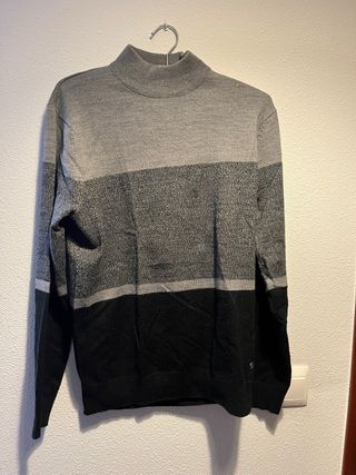 Jersey de punto gris claro con cuello alto y manga larga, en talla L. Diseño moderno y cómodo. Detalle de canalé en cuello y puños. 34% acrilico, 44% poliamida y 22% poliester. Nuevo sin estrenar.