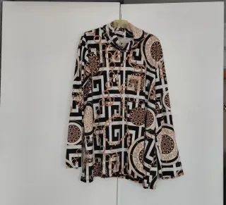 Jersey de mujer con cuello alto talla Única. Medidas: de sisa a sisa 68cm sin estirar, largo 70cm. Tejido de terciopelo. Estampado geométrico y de cadenas en tonos negro y dorado. Es súper suave y calentito.