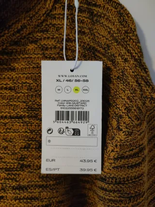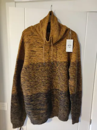 Jersey de punto con cuello alto y cordones. Un diseño moderno y cómodo. Tela muy agradable. Es más grande que una típica XL. - Tejido 100% algodón. - Diseño jaspeado en tonos mostaza y negro. - Cuello alto acanalado.