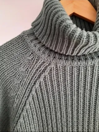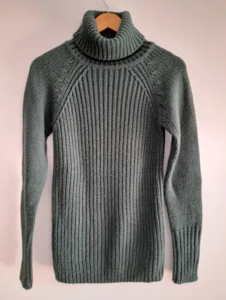 Jersey de punto fino en color verde oliva. Presenta un diseño con cuello alto y mangas abullonadas con detalle de canalé. - Talla S pero queda ancho - Tejido acanalado. - Cuello alto. - Mangas largas abullonadas.
