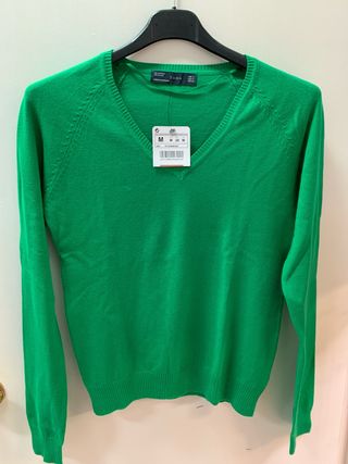 Jersey de punto fino de Zara, ideal para un look casual. - Cuello en pico. - Manga larga. - Bajo y puños de canalé.