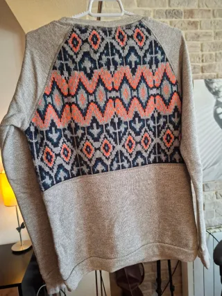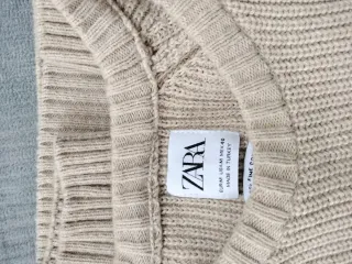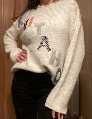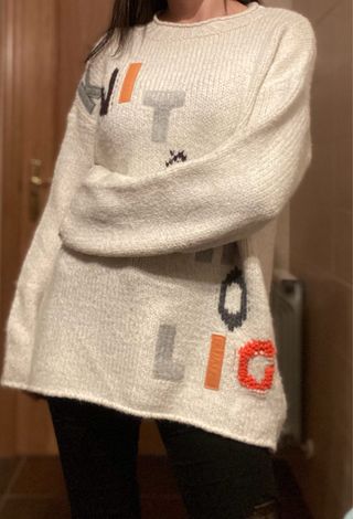 Jersey de punto de la marca Zara con un diseño moderno y llamativo. - Tejido suave y confortable. - Detalle de letras y formas aplicadas en la parte delantera. - Manga larga y cuello redondo.