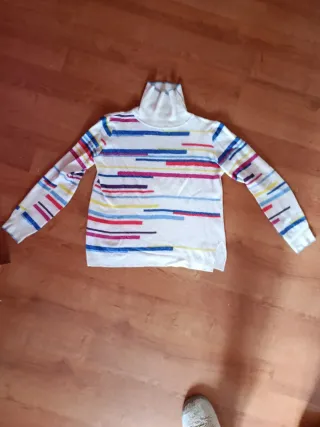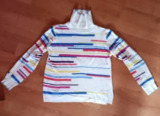 Jersey de chica con cuello alto y estampado de rayas horizontales en varios colores. - Diseño de rayas discontinuas en azul, rojo, amarillo y morado. - Cuello alto acanalado. - Manga larga.