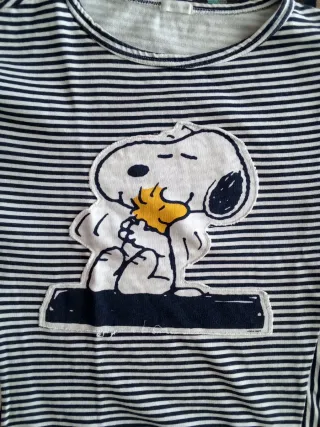 Jersey de pijama con un divertido diseño de Snoopy. Como nuevo. Algodón. - Manga larga. - Estampado de rayas azules y blancas. - Parche de Snoopy con Woodstock en el frontal.