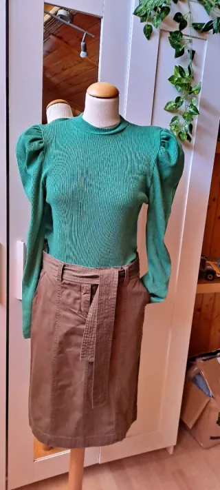 Lo vendo porque ya no lo uso. Si te lo preguntas sí, es 100% original. El color está entre el amarillo y el mostaza, y buscando algunas referencias del color me sale como color trigo. De tacto suave, ligero y muy cómodo, de uso muy versátil. Pese a su uso, está como el primer día, no presenta ningún síntoma de desgaste ni nada, aunque la tinta de las etiquetas de composición sí se han descolorido un poco. Es de fabricación española y 100% algodón.