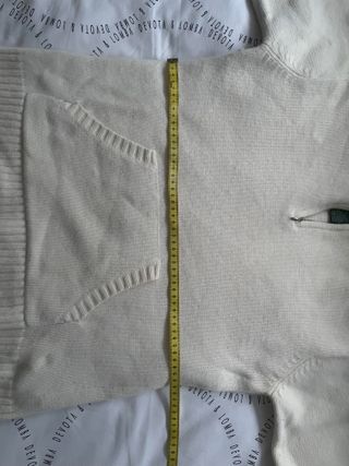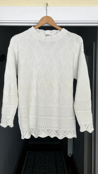 📌 Jersey de algodón blanco roto con detalles calados. - Manga larga. - Cuello redondo. - Muy buen estado. - Talla M (57 cms de hombros, 55 cms entre axilas y 63 cms de largo).