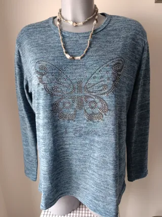 Jersey de manga larga con un bonito diseño de mariposa adornada con strass. Diseño de mariposa con pedrería. Tejido suave y cómodo. Cuello redondo, manga larga. Falta algún strass, pero es inapreciable. En muy buen estado. Marca Local, talla XXL/3XL 80% Algodón 20% Elastán Hombros 46 Pecho 55 Largo 67 Art Pam 26 C8