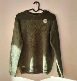 Jersey Lois - Estilo Urbano 🐂 Diseño: Suéter de cuello redondo en color verde militar con un tejido de punto con textura de "grano de arroz". Detalles Frontales: Parche circular estilo retro en el pecho con el texto "Lois Jeans - Genuine Article". Pequeña placa metálica con el logo de Lois en el borde inferior derecho. Detalles en la Espalda: Cremallera decorativa (o funcional de ajuste) en el hombro izquierdo. Logo de la marca y el mítico toro de Lois bordados en blanco en la parte superior central. Composición y Talla: Hecho de 60% acrílico y 40% algodón. Talla 12 (ideal para niños/adolescentes). Diseñado en España.