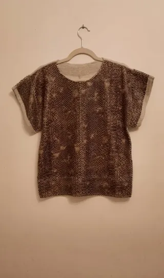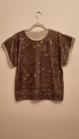 Jersey o chaleco de manga corta con un diseño llamativo. - Estampado tipo piel de serpiente. - Mangas cortas. - Cuello redondo. Tiene una textura que, cuando tocas, imita el piel de serpiente, muy original. Base y espaldas hecha de algodón. Ancho 49/50(100) cm, largo 62 cm.