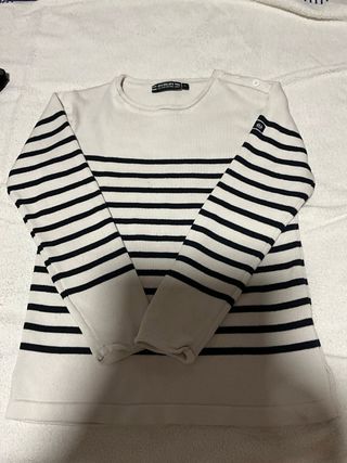 Jersey beige con franjas azul marino y marrón con un diseño de cuello redondo muy cómodo y moderno. Con tejido de punto. Apenas se ha usado, está en perfecto estado. 100% algodón.