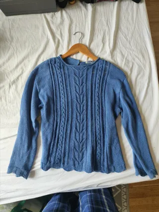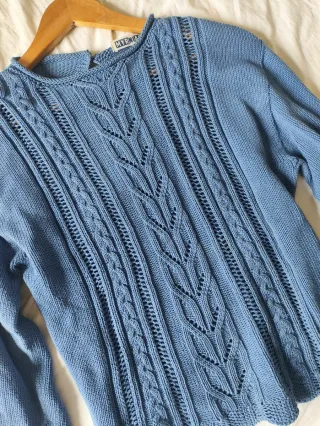 Jersey de punto azul, con diseño intrincado y elegante. - 100% algodón - Fabricado en España - Color azul vibrante - Detalle de trenzas y calados