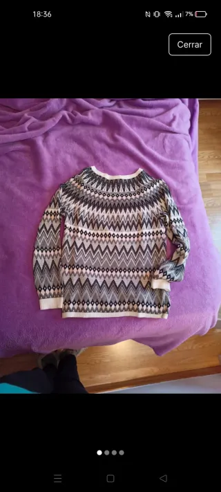 Jersey de punto con un diseño geométrico y rayas. Jersey de colores. Acrílico, poliéster y algodón - Cuello redondo. - Manga larga. - Azul, rojo, blanco y tiene pequeñas lentejuelas. Medidas: ancho de Hombros 41 cm Sisa 45 cm Largo 56 cm
