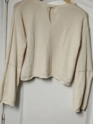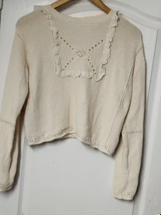 Jersey de punto fino en color crudo, ideal para añadir un toque delicado a tu estilo. - Material: Algodón. - Diseño con cuello redondo y detalles de volantes. - Manga larga. - Bajo y puños con acabado festoneado.