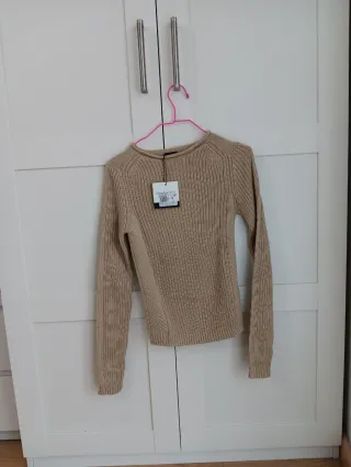 Jersey de punto con un diseño de rayas texturizadas en tonos beige y marrón. - Cuello redondo. - Manga larga. - Tejido de punto con relieve. - 100% algodón - Prácticamente nuevo.