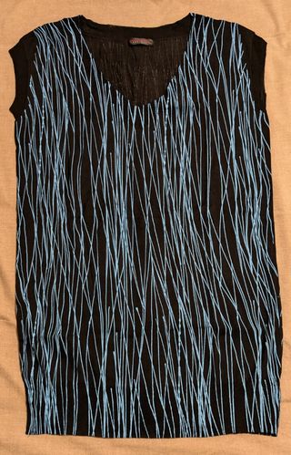Poco uso, como se ve en las fotografías. Jersey de punto, sin mangas, tipo chaleco del diseñador barcelonés Custo Barcelona. Cuello pico, fondo negro con rayas azules con un poco de relieve. Marca: Custo Barcelona Talla: S Medidas: Ancho 44 cm / Largo: 70 cm (2 últimas fotos) Composición: Algodón y Poliéster (Rayón) Otras prendas en mi armario. Posibilidad de hacer lote. #womenswear #spanishdesign #custobarcelona #sweater #womensvesttop #womensvest #topfemme #barcelona #spanishdesigner