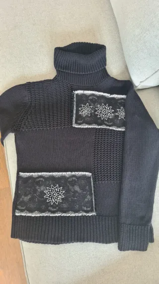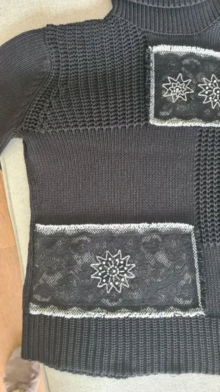 Jersey grueso de invierno con un diseño moderno y detalles únicos. - Cuello alto - Tejido de punto 50% algodón / 50% poliester - Aplicaciones de encaje con bordado - Combinación de texturas en el tejido