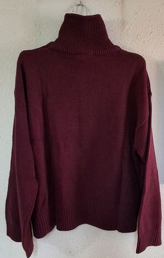 Amplio jersey en color granate con cuello alto y media cremallera delante. De axila a axila: 60 cm. Largo: 65 cm. 50% algodón, 50% acrílico. --- Perfecto para regalar.