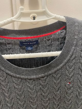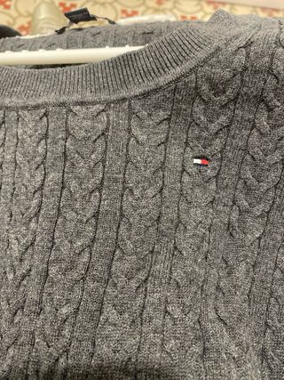 Jersey gris de punto grueso Tommy Hilfiger (Talla S) 🧶 Clásico y atemporal, ideal para días fríos. ✔️ 100% algodón, con logo bordado en el pecho. ✔️ Diseño trenzado tipo cable knit, muy favorecedor. ✔️ Corte recto, cuello redondo, tejido suave y abrigado. 📸 En perfecto estado, sin bolitas ni signos de uso. 🎁 Ideal para regalar o renovar tu armario con estilo.