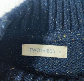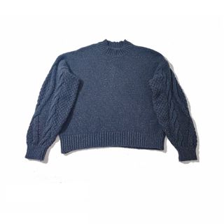 Twothirds/ Jersey oversize de punto grueso azul marino melange talla M. No tiene etiqueta composición, es algodón. Escote redondo, hombros caídos, mangas de punto trenzado. Ancho de hombros: 64 cm. Ancho de pecho: 58 cm. Largo: 58 cm. Largo de mangas: 52 cm. En muy buen estado,sin faltas.