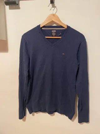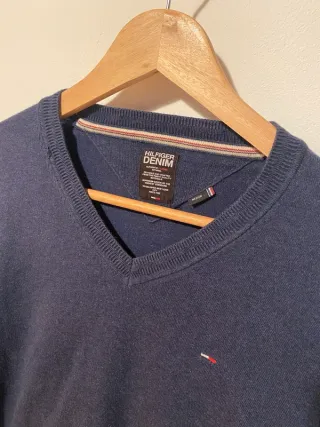 Jersey de la marca Hilfiger Denim en talla M y color azul con cuello en pico. Material: 82% algodón, 15% nailon y 3% elastano