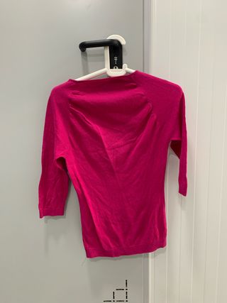 Jersey de manga tres cuartos.45% lana y 55% seda. Tiene un hilito suelto en el escote Talla M pequeña con 41 cm de sisa a sisa y 61 cm de largo - Diseño con cuello barco. - Tejido suave y ligero.