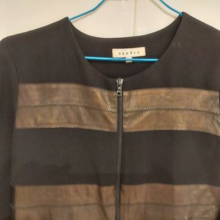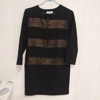 Vestido negro de la marca Sandro, de la talla 38. Es un vestido de algodón y apliques de ecopiel. Con cremallera en el cuello. De forma ligeramente abombado ( no es ceñido) y largo por encima de la rodilla. Es muy cómodo y ponible. La manga es francesa 3/4 y puede llevarse voy un jersey de cuello alto, es de otoño/invierno