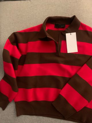 Jersey de algodón de Zara con un diseño de rayas llamativo. - Combinación de colores rojo y marrón. - Cuello tipo polo con botones.